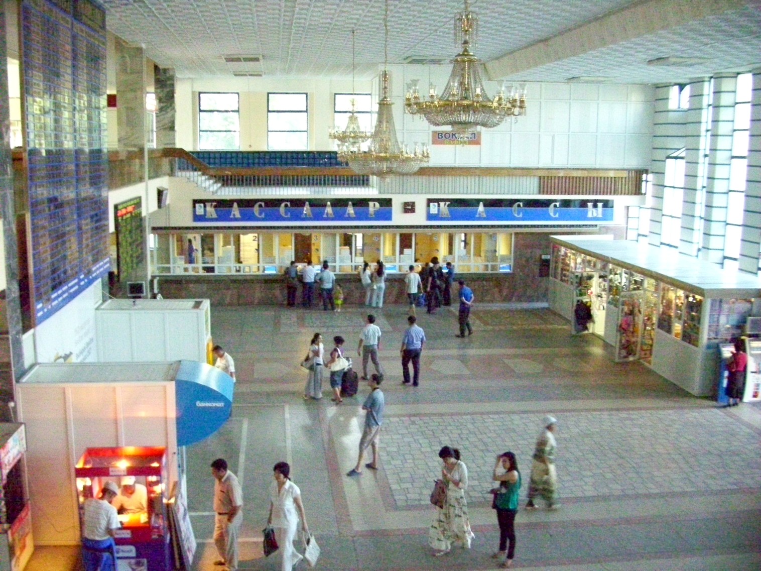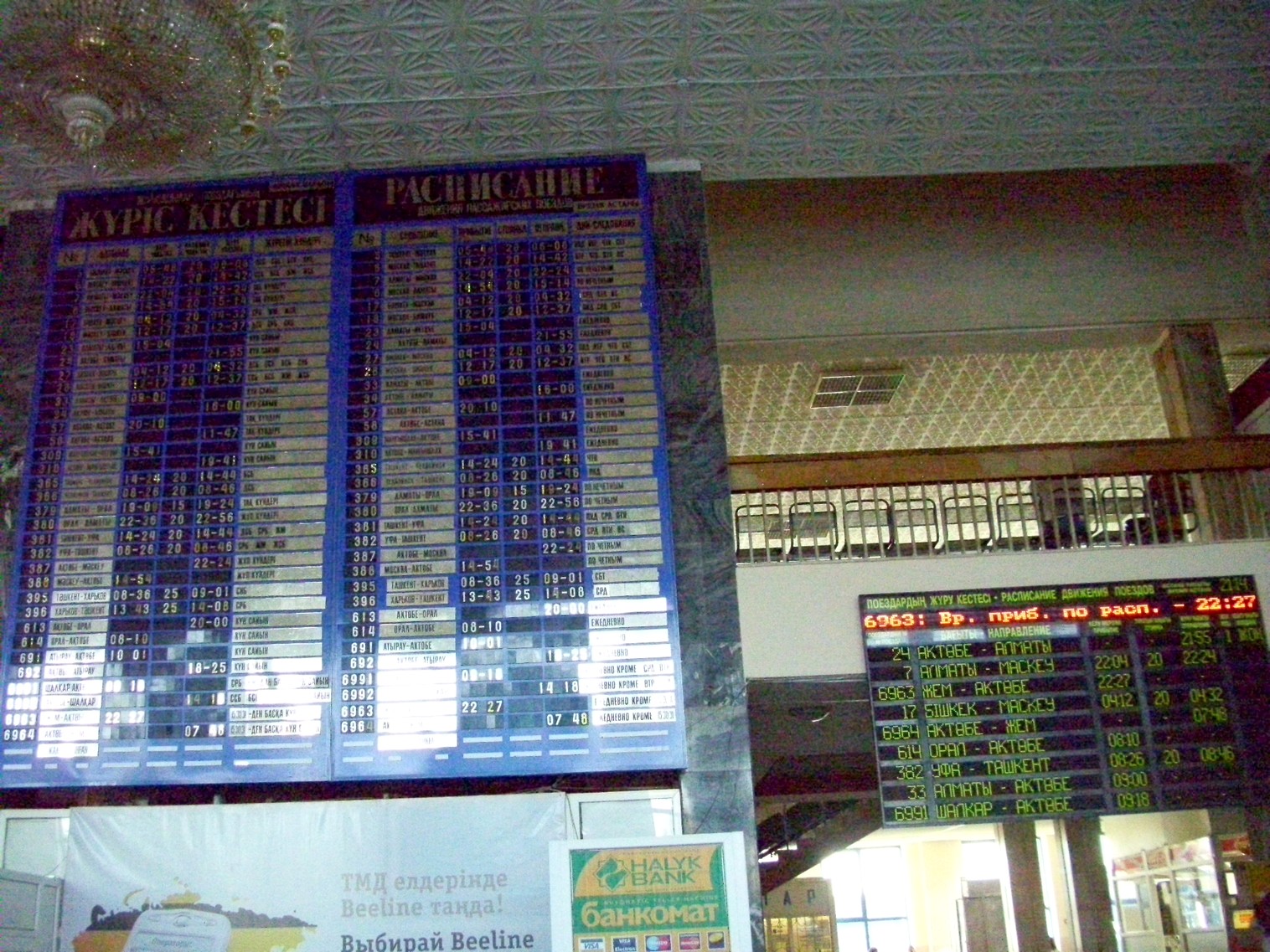 Расписание движения поездов, вывешенное на вокзале станции Актюбинск.