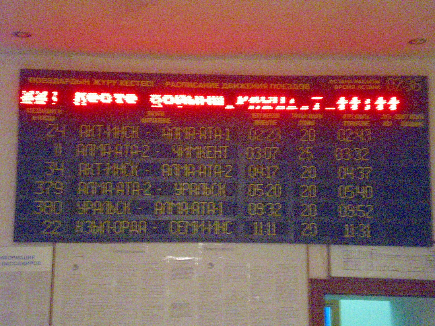Станция Джамбул. Информационное табло на вокзале, отображающее ближайшие поезда. Примечательно,