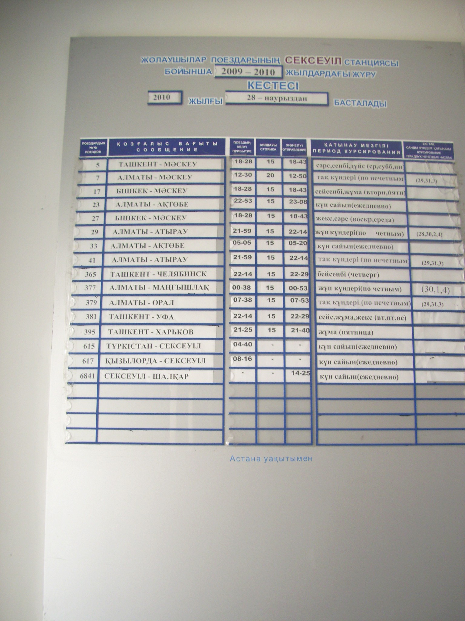 Расписание движения поездов, вывешенное на вокзале станции Саксаульская.