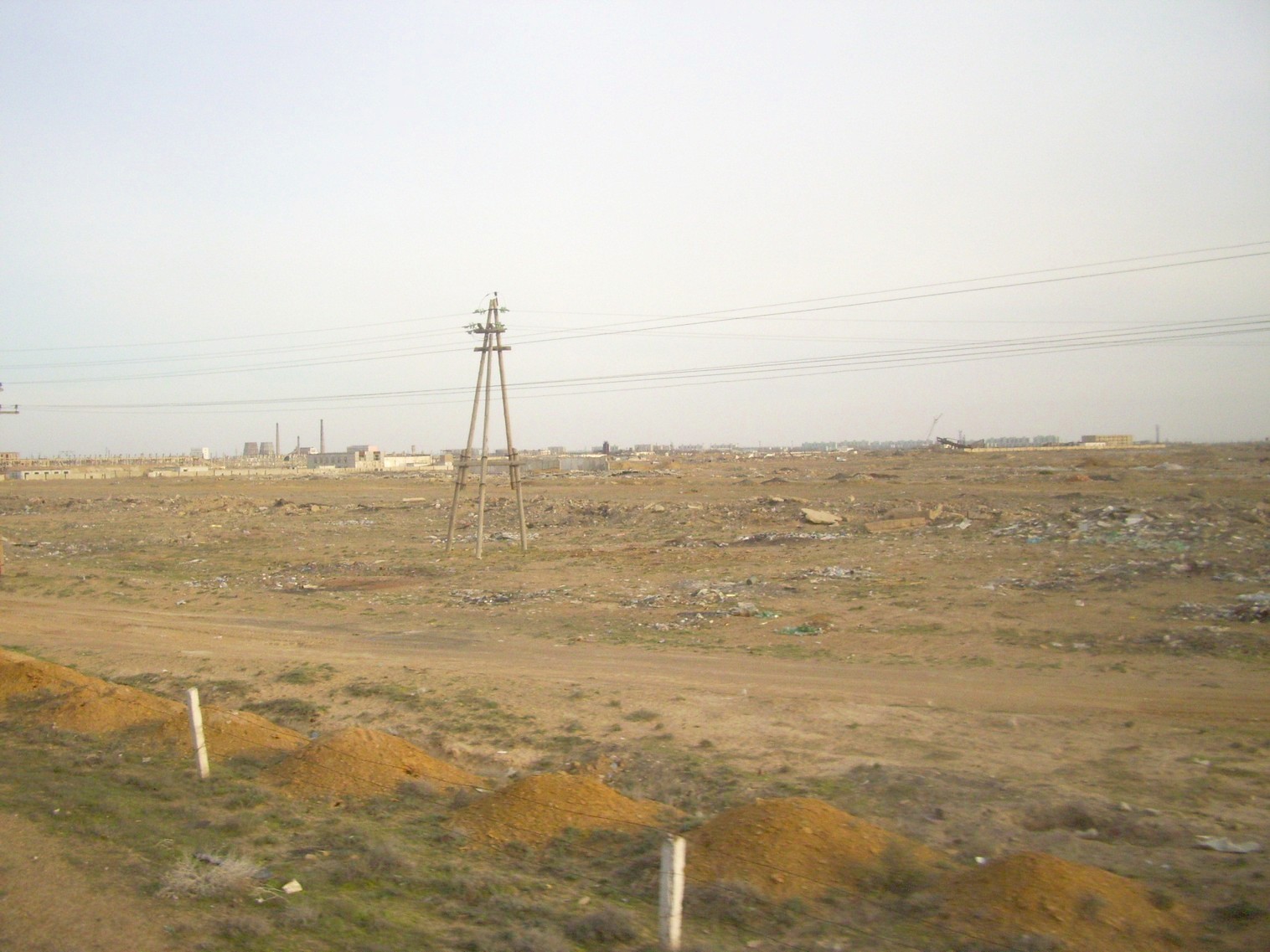 Поезд приближается к станции Тюратам. Справа от железнодорожной магистрали среди пустыни появляются