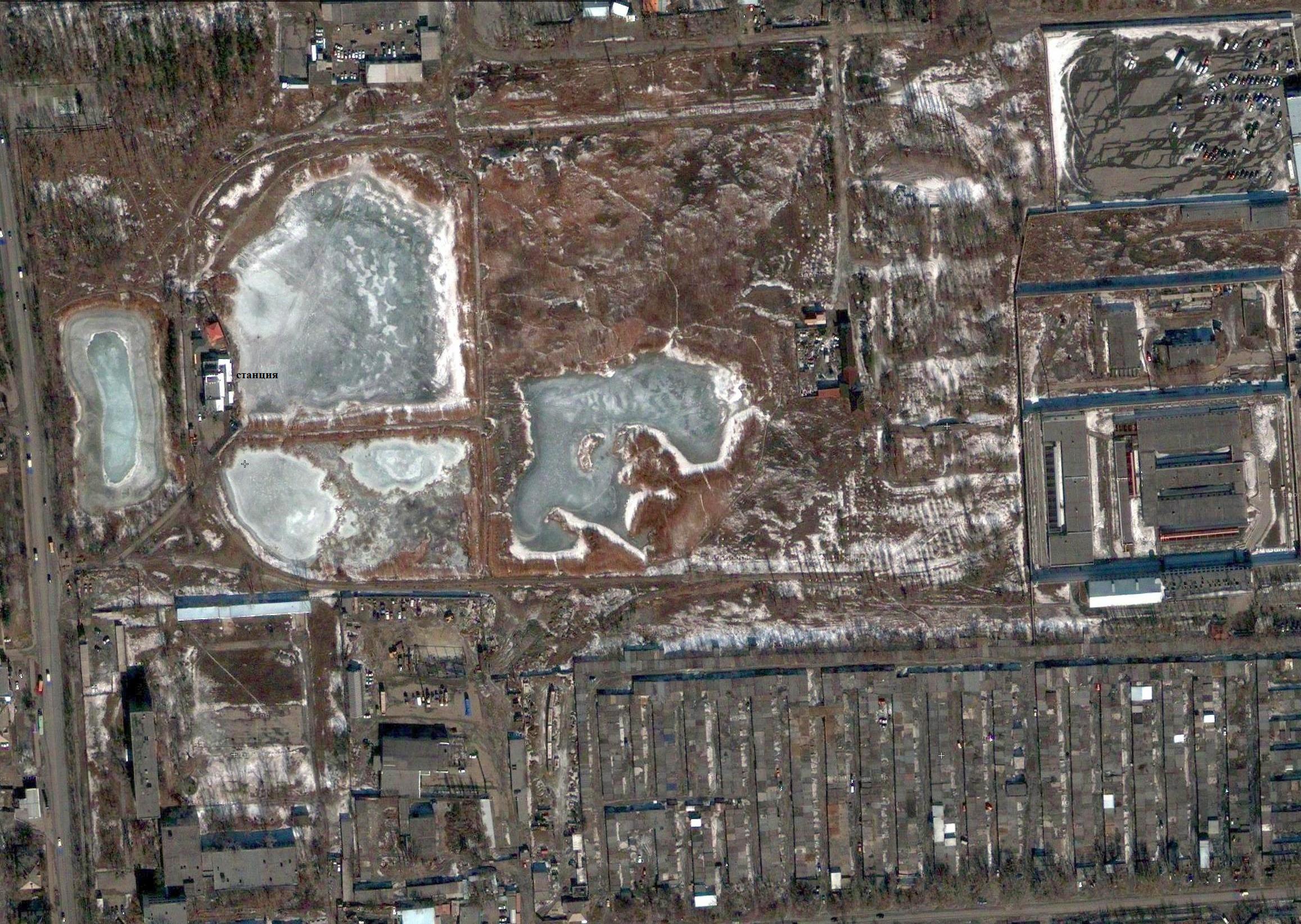 Узкоколейная железная дорога на спутниковом снимке (источник — «Google Maps», ориентировочная дата съёмки — 2005 год).