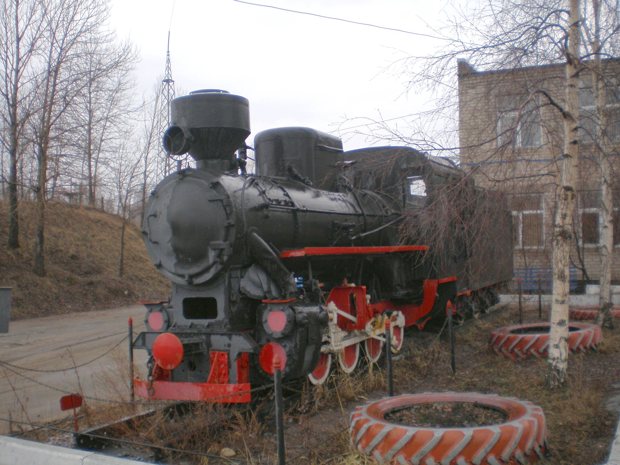 Тепловоз ТУ6А-2242 (?) с составом вагонеток, загруженных белой шпалой. Здание локомотивного депо.