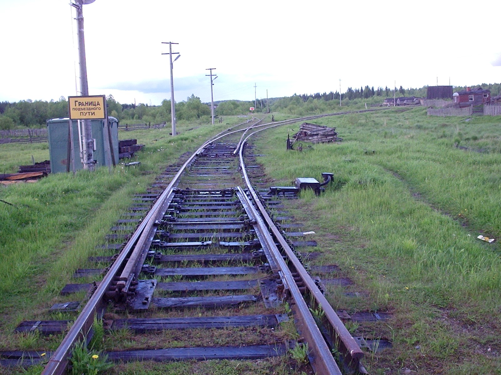 Табличка «граница подъездного пути». Вправо — нижний склад, прямо — Солюга и Великая Речка...