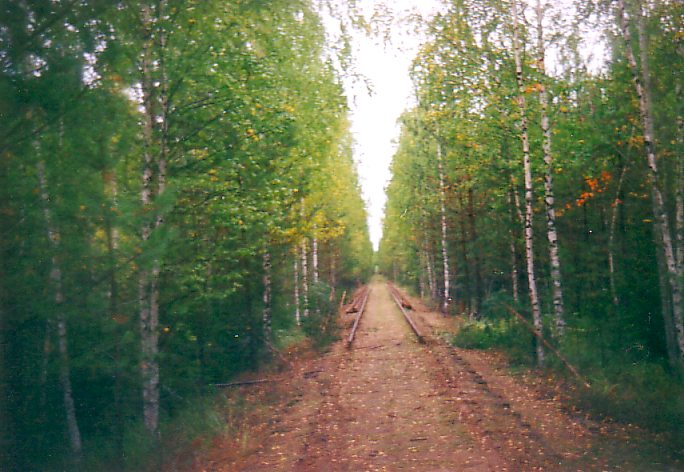 Железнодорожный путь, местами сильно заросший травой, проложен прямо, как по линейке. Кое-где сомкнувшаяся над ним густая листва образует зелёный пока еще свод. Вокруг — бескрайний лес, тронутый осенними красками.