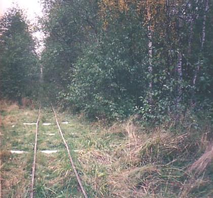 запад. Линия узкоколейной железной дороги углубляется в лес.