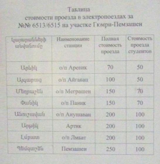 Стоимость проезда (скопировано 7 октября 2010 года на вокзале Гюмри).