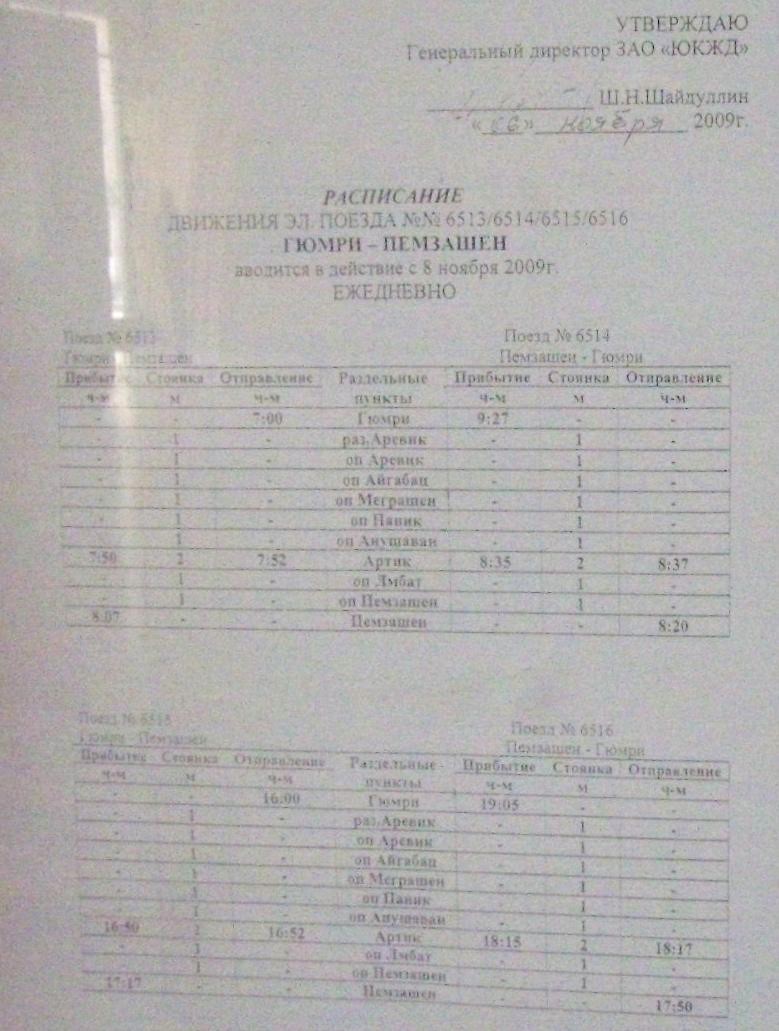 Расписание движения поездов с 8 ноября 2009 (скопировано 7 октября 2010 года на вокзале Гюмри).