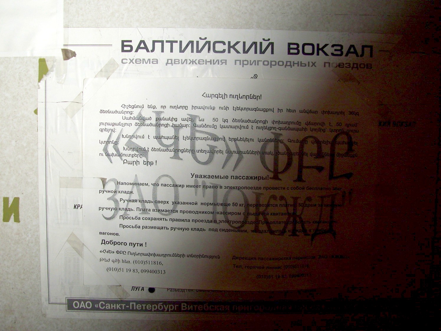 Объявление в вагоне электропоезда ЭР2-909, следующего из Гюмри в Пемзашен.