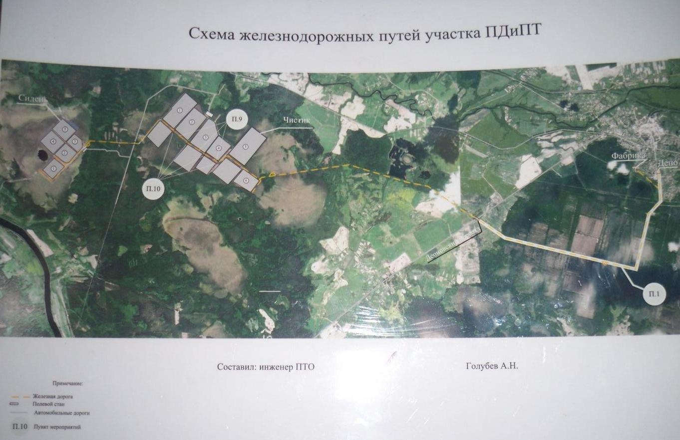 Узкоколейная железная дорога на служебной схеме торфопредприятия. Скопировано 31 июля 2013 года.