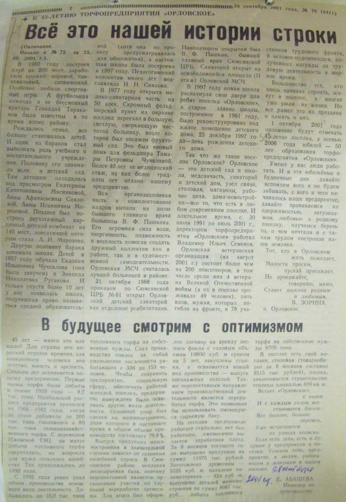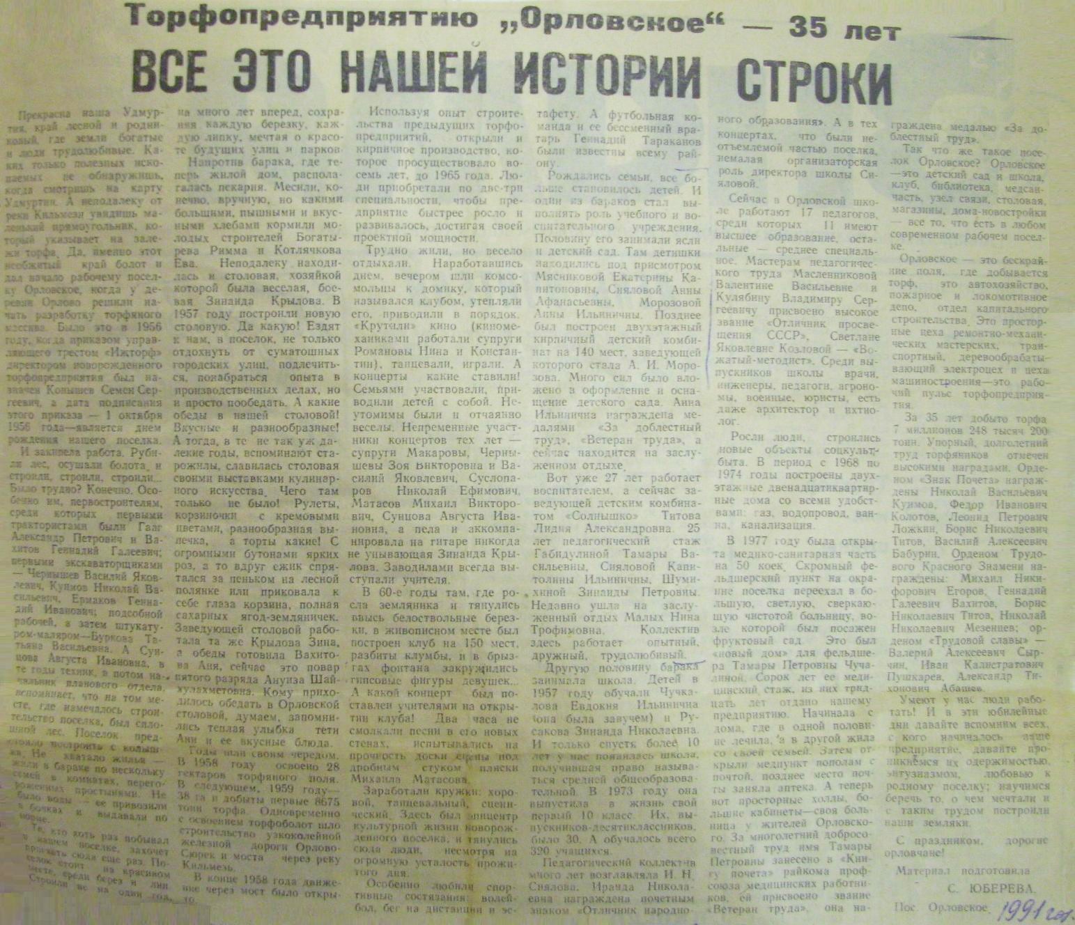 «Торфопредприятию «Орловское» — 20 лет» (сюмсинская районная газета «Знамя», 30 сентября 1976 года).