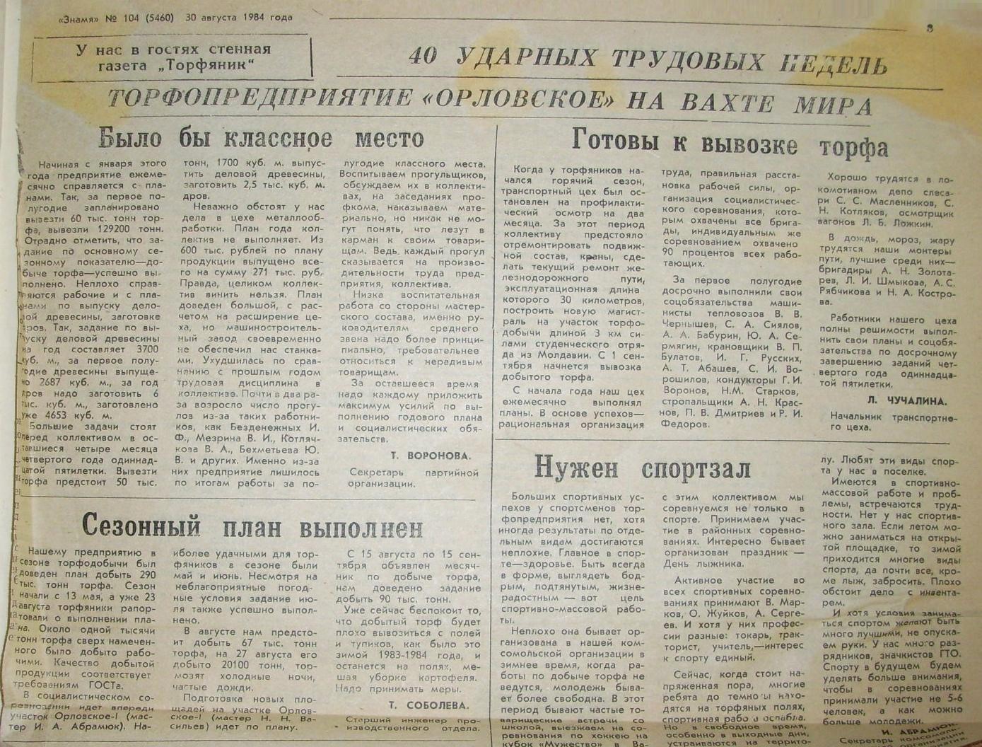 «Торфопредприятие «Орловское» на вахте мира» (сюмсинская районная газета «Знамя», 30 августа 1984 года).