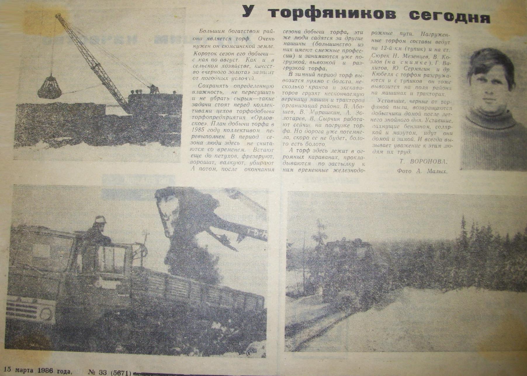«У торфяников сегодня» (сюмсинская районная газета «Знамя», 15 марта 1986 года).