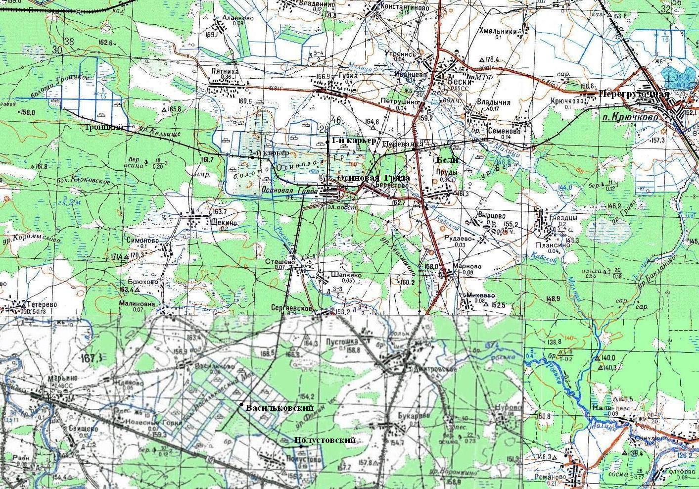 Узкоколейная железная дорога на топографической карте масштаба 1:100 000, изданной в 1988 году.