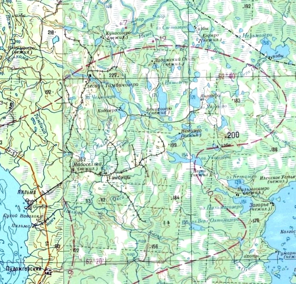 Узкоколейная железная дорога на топографической карте масштаба 1: 200 000, изданной в 199? году.