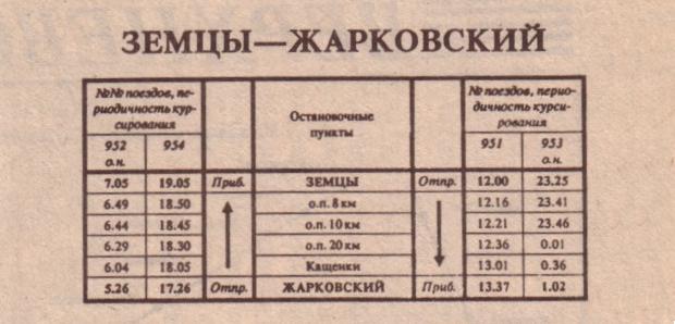 По состоянию на 1994 год, грузопассажирский (пригородный) поезд сообщением Земцы — Жарковский курсировал ежедневно (одна пара в сутки). Ещё одна пара поездов значилась в служебных расписаниях как курсирующие по указанию.
