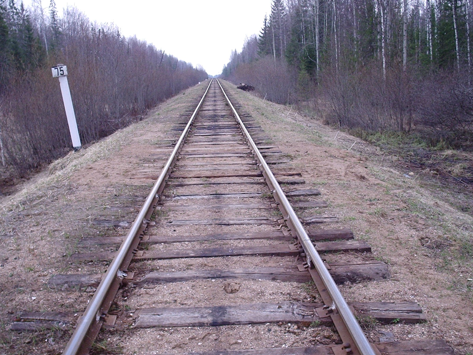 Знак подачи сигнала в кривой перед о.п. 76 км (посёлок Сокольники, нижний склад Пылинского лесопункта).