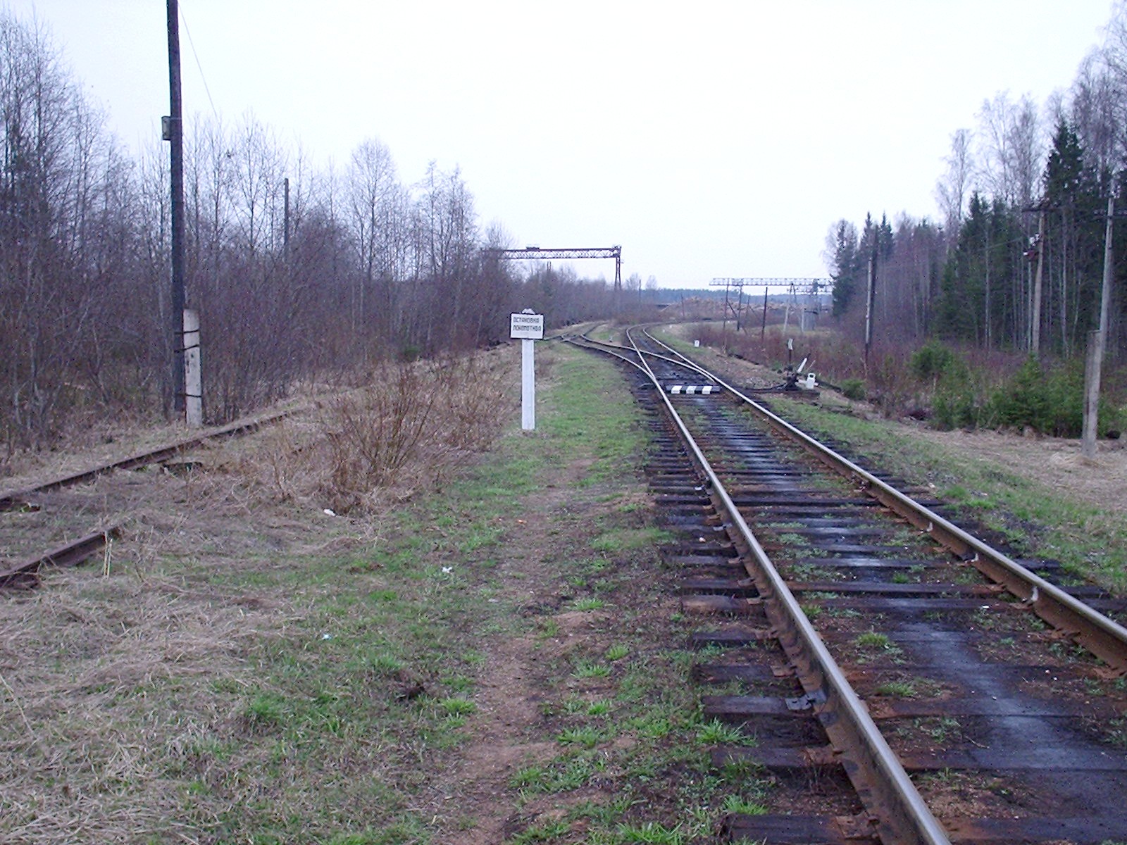 и знак остановки локомотива (остановочный пункт 76 км). Вид в западном направлении.