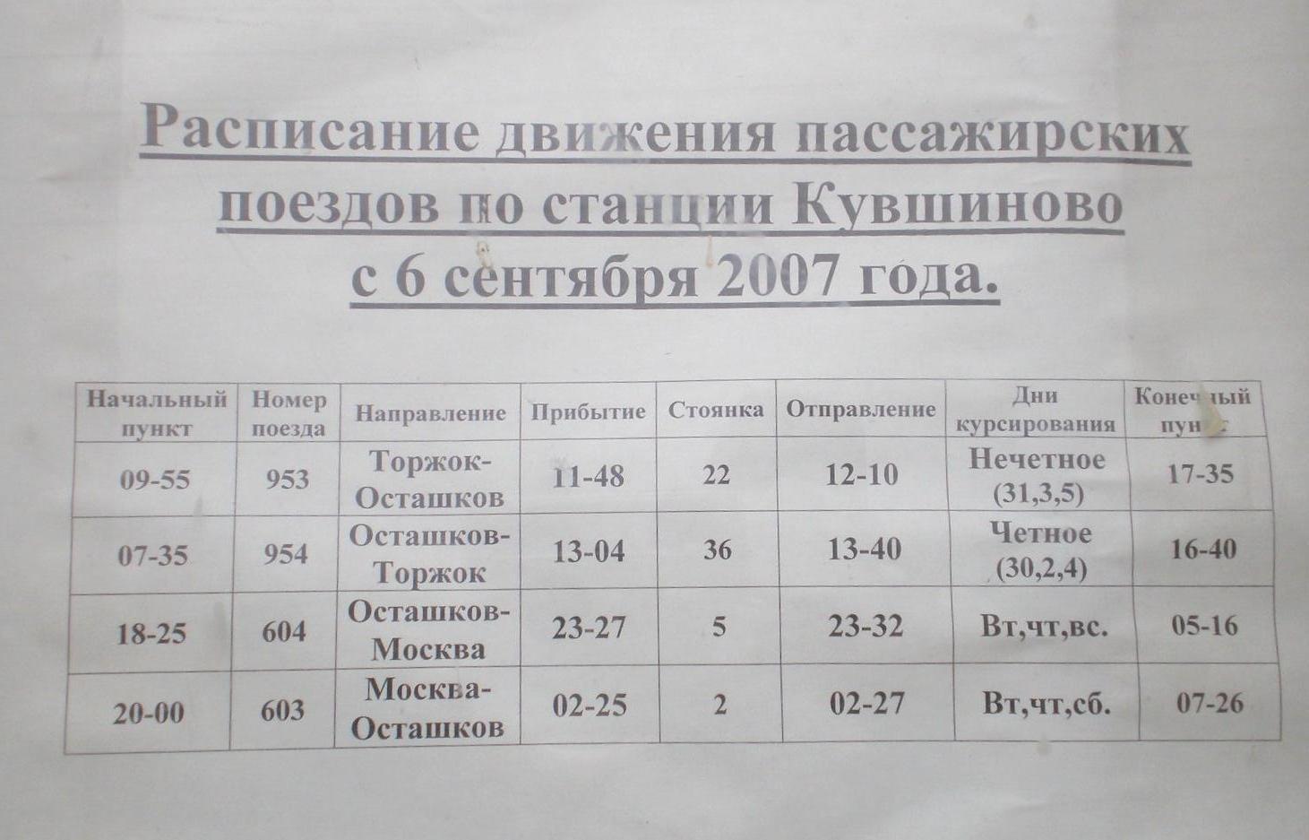 Расписание движения поездов, вывешенное на вокзале станции Кувшиново.