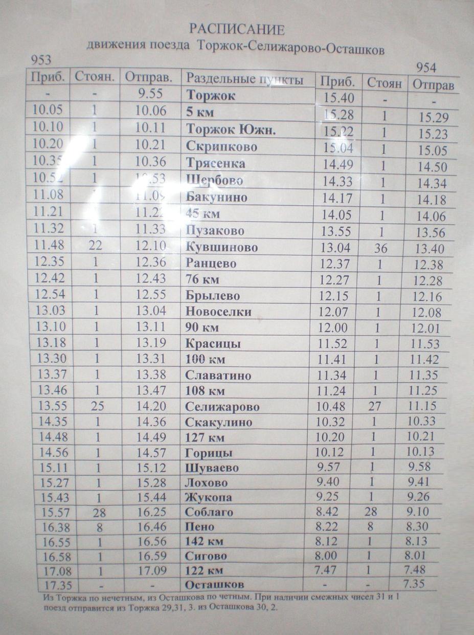 вывешенное в вагоне поезда. Поезд сообщением Москва — Осташков не отображён.