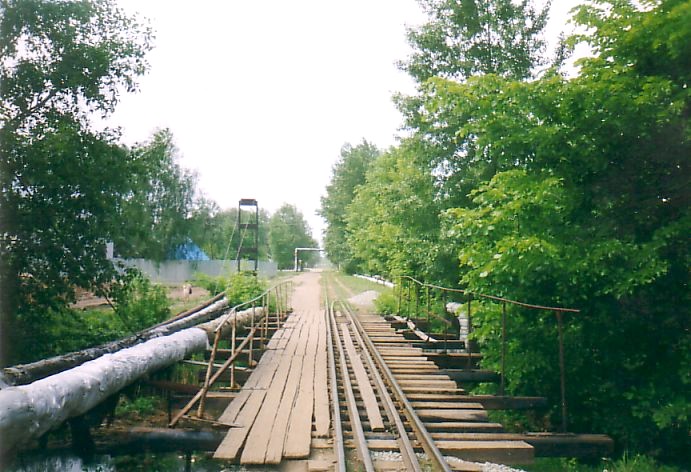 Для начала иду вдоль линии узкоколейной железной дороги пешком. Первое, что встретится западнее станции Выкса-Верхняя — пересечение с оживлённой городской улицей. Здесь путь узкоколейной железной дороги залит водой из трубы, давшей течь. Рельсы сильно искривлены под воздействием пересекающего их автотранспорта. Далее линия пролегает вдоль тихой улицы Шлаковая. Путь всюду находится в плохом состоянии. Между станцией Выкса-Верхняя и точкой пересечения с подъездными путями широкой колеи расположен единственный на узкоколейной железной дороге деревянный мост.