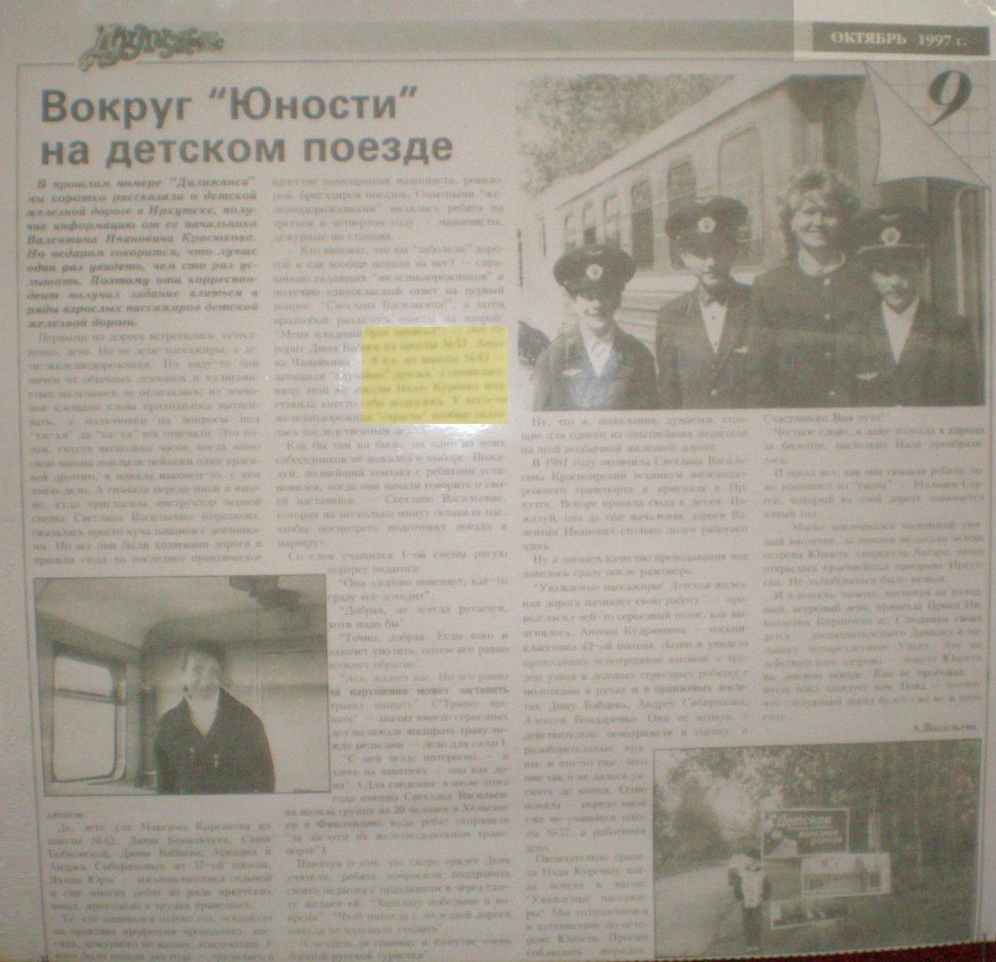 «Вокруг «Юности» на детском поезде». Газета «Дилижанс», октябрь 1997 года.