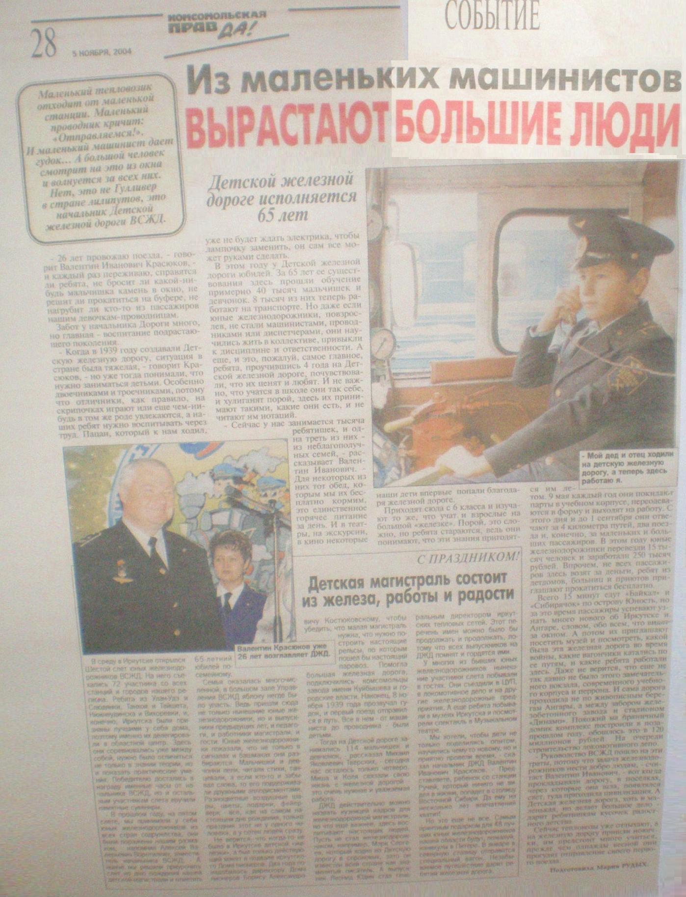 «Из маленьких машинистов вырастают большие люди». Газета «Комсомольская Правда», 05.11.2004.