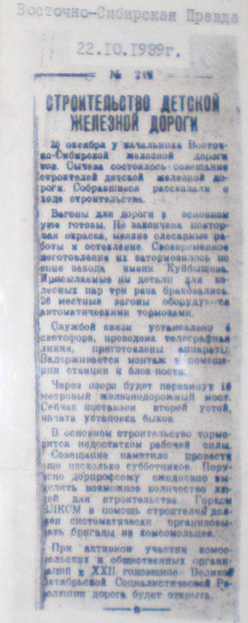 «СТАРАЯ» МАЛАЯ ВОСТОЧНО-СИБИРСКАЯ ДЕТСКАЯ ЖЕЛЕЗНАЯ ДОРОГА МАТЕРИАЛЫ СРЕДСТВ МАССОВОЙ ИНФОРМАЦИИ