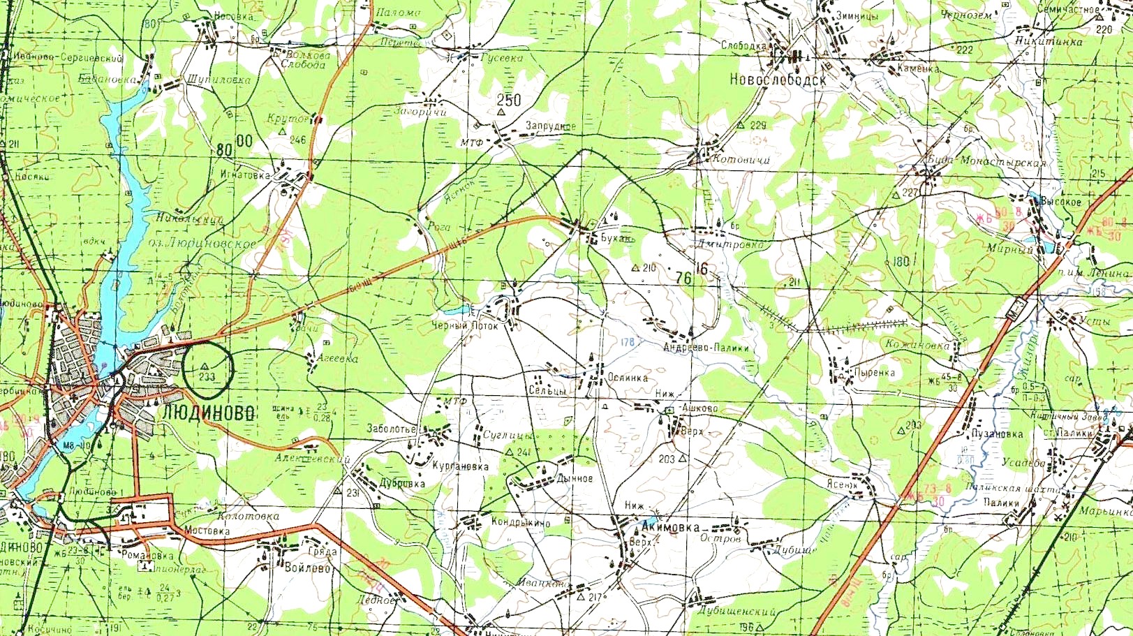 Участок Людиново — Палики на топографической карте масштаба 1:200 000 («состояние местности на 1980-83-гг., издание 1986 года»). Узкоколейная