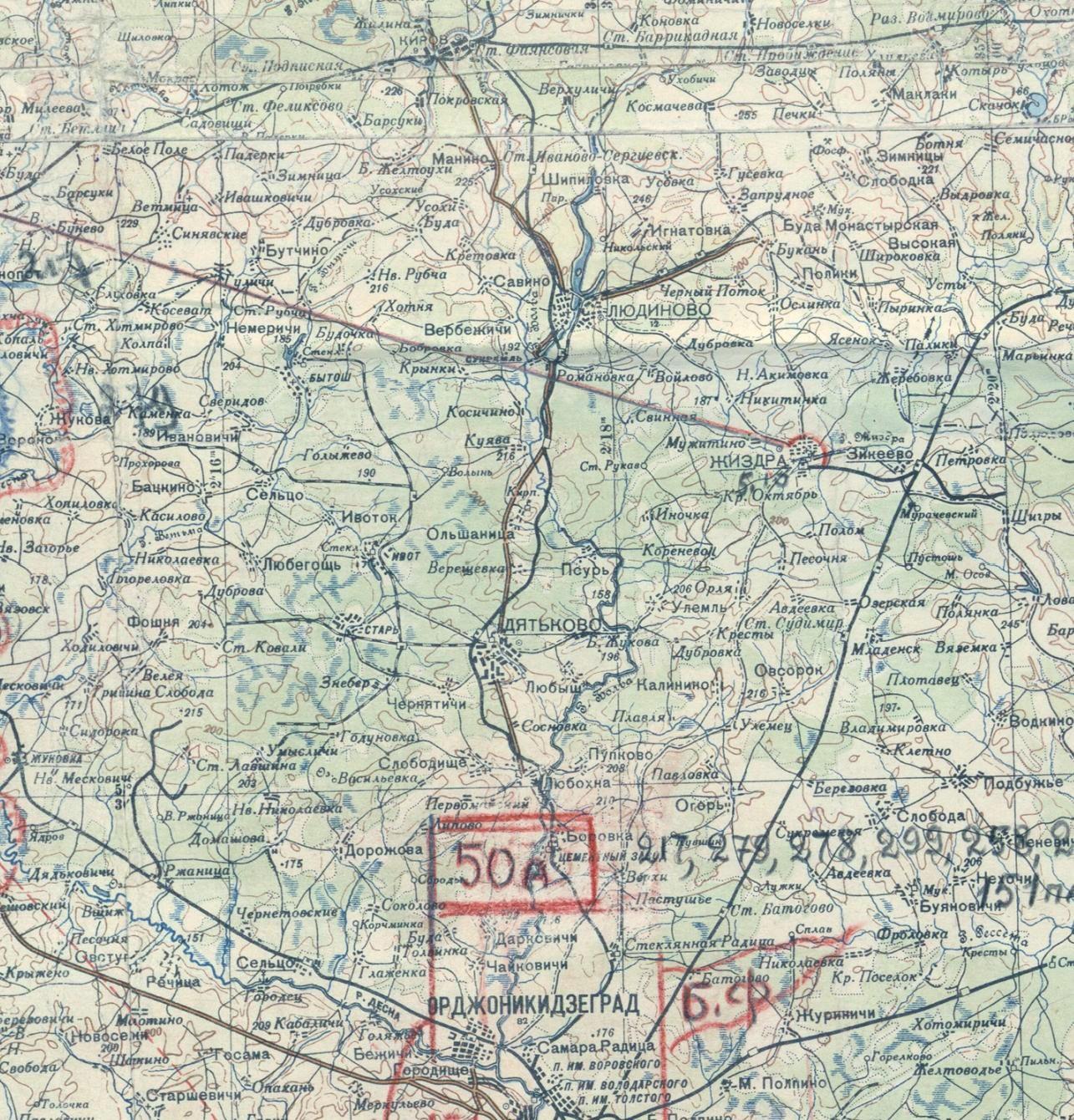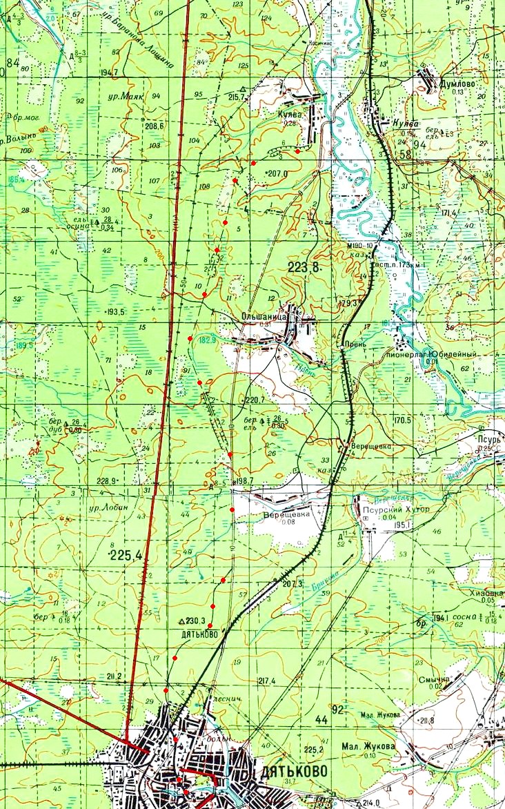 Разобранный участок Дятьково — Куява на топографической карте масштаба 1:100 000 (нанесён условно).