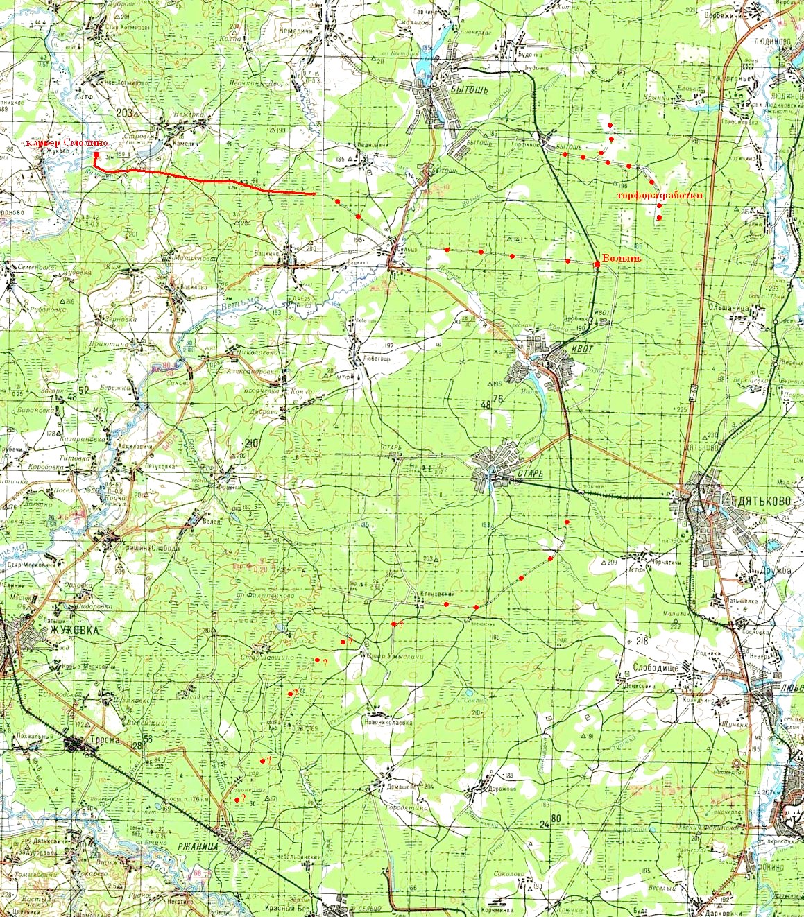 Разобранные участки Волынь — Сельцо — карьер Смолино, Торфяное — торфоразработки на топографической карте масштаба 1:200 000,