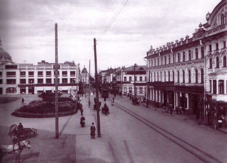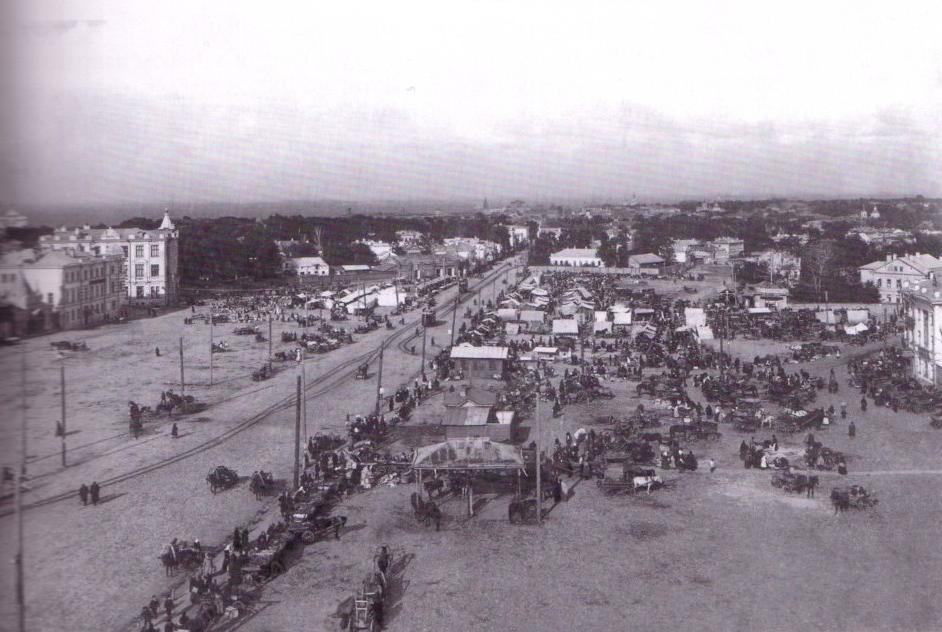 «Ново-Базарная площадь (ныне — площадь Горького). Вправо линия уходит на Полевую улицу. 1899 год».