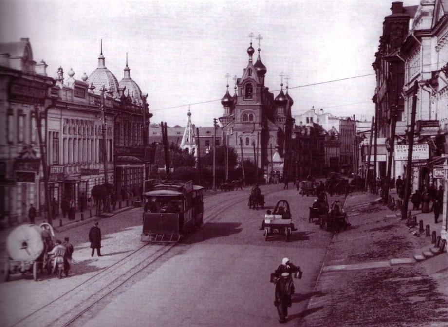 «Нижне-Базарная линия проходила по Рождественской улице. В центре видна колокольня XVII века,