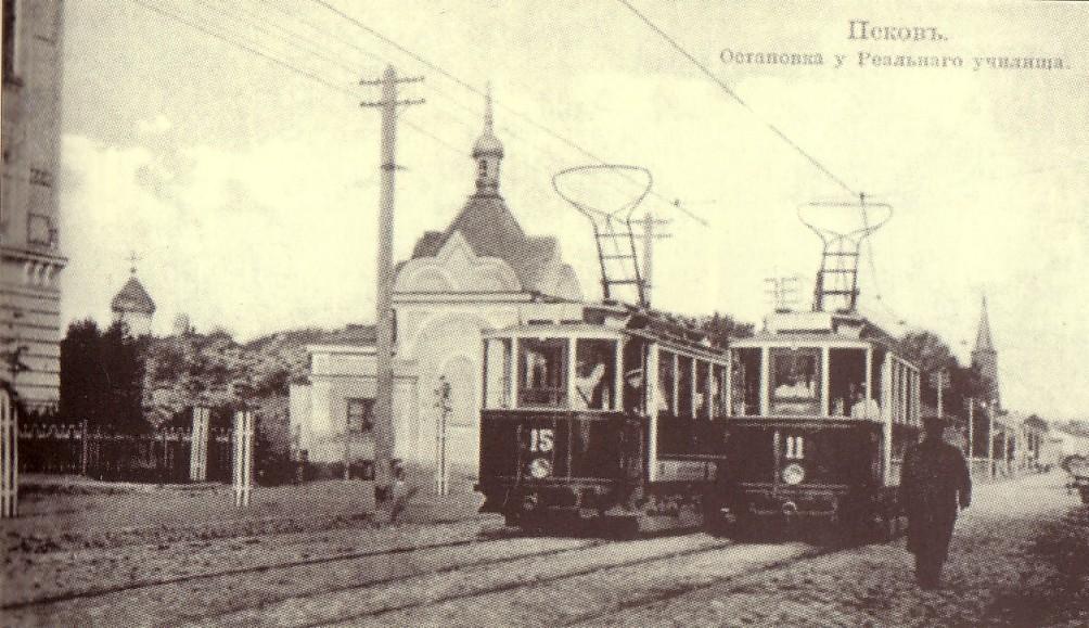 9 (22) января 1912 года была открыта первая линия электрического трамвая. Она пролегала по направлению Варшавский вокзал (ныне станция Псков — единственный вокзал в городе) — Кохановский бульвар — Сергиевская улица (позднее Кохановский бульвар был переименован в Пролетарский, Сергиевская улица — в Октябрьскую, с 1959 года бывшие Кохановский бульвар и Сергиевская улица составляют Октябрьский проспект) — Плоская улица (позднее — улица Профсоюзов) — Великолуцкая улица (позднее — Советская улица) — Дровяная улица — Нарвская улица (ныне улица Леона Поземского).