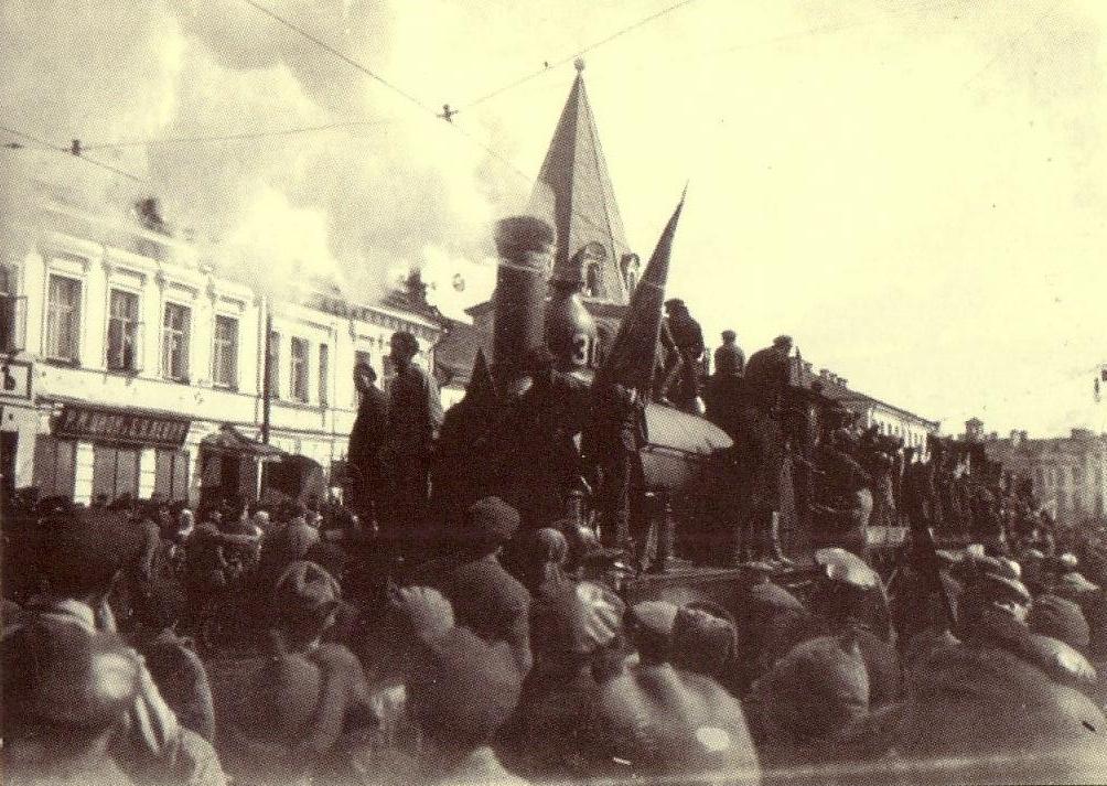 Паровоз на трамвайной линии. Оригинальная подпись — «Демонстрация 1 мая 1923 года на Великолуцкой улице».