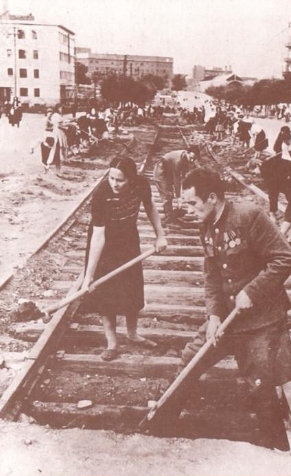 «Один из первых трамваев 7 ноября 1947 года на улицах города».