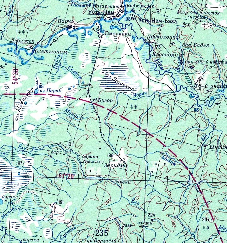 Узкоколейная железная дорога на топографической карте масштаба 1:500 000, изданной в 197? году.