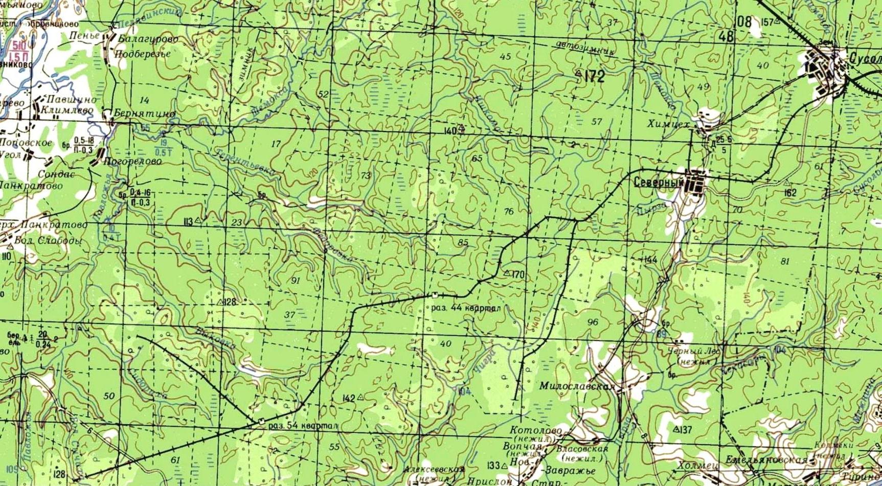 Узкоколейная железная дорога на топографической карте масштаба 1:100 000, изданной ориентировочно в 1990 году.