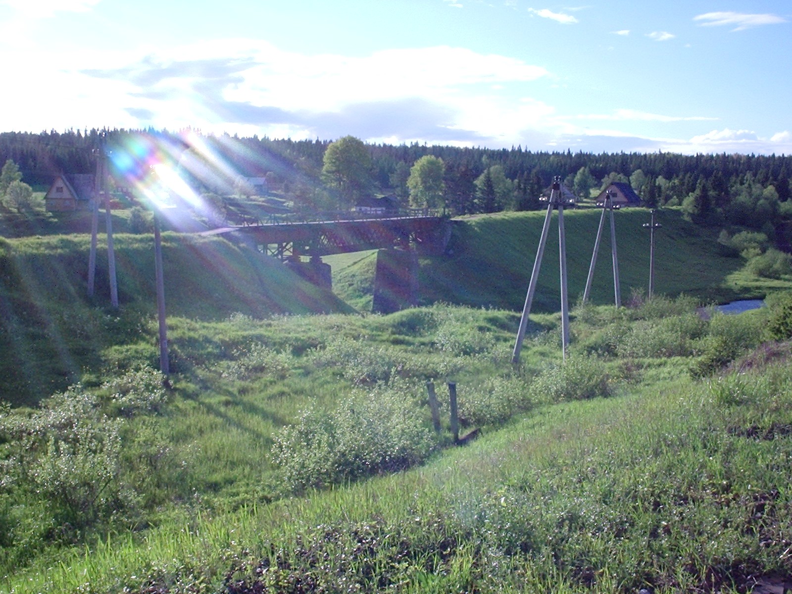 Мост через реку Няндома на действующем магистральном участке (перегон Бурачиха — Зелёный). Вид в северном направлении.
