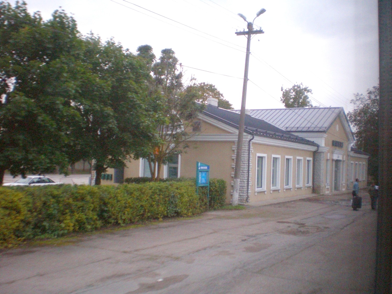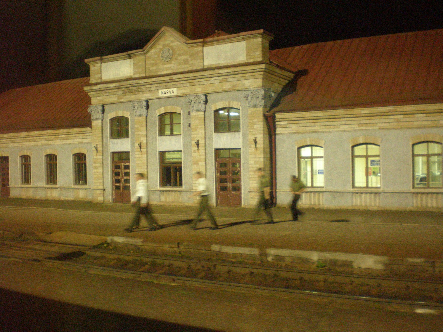 Вокзал на станции Нарва. Из вокзала к поезду Таллин — Москва направляются пограничники.