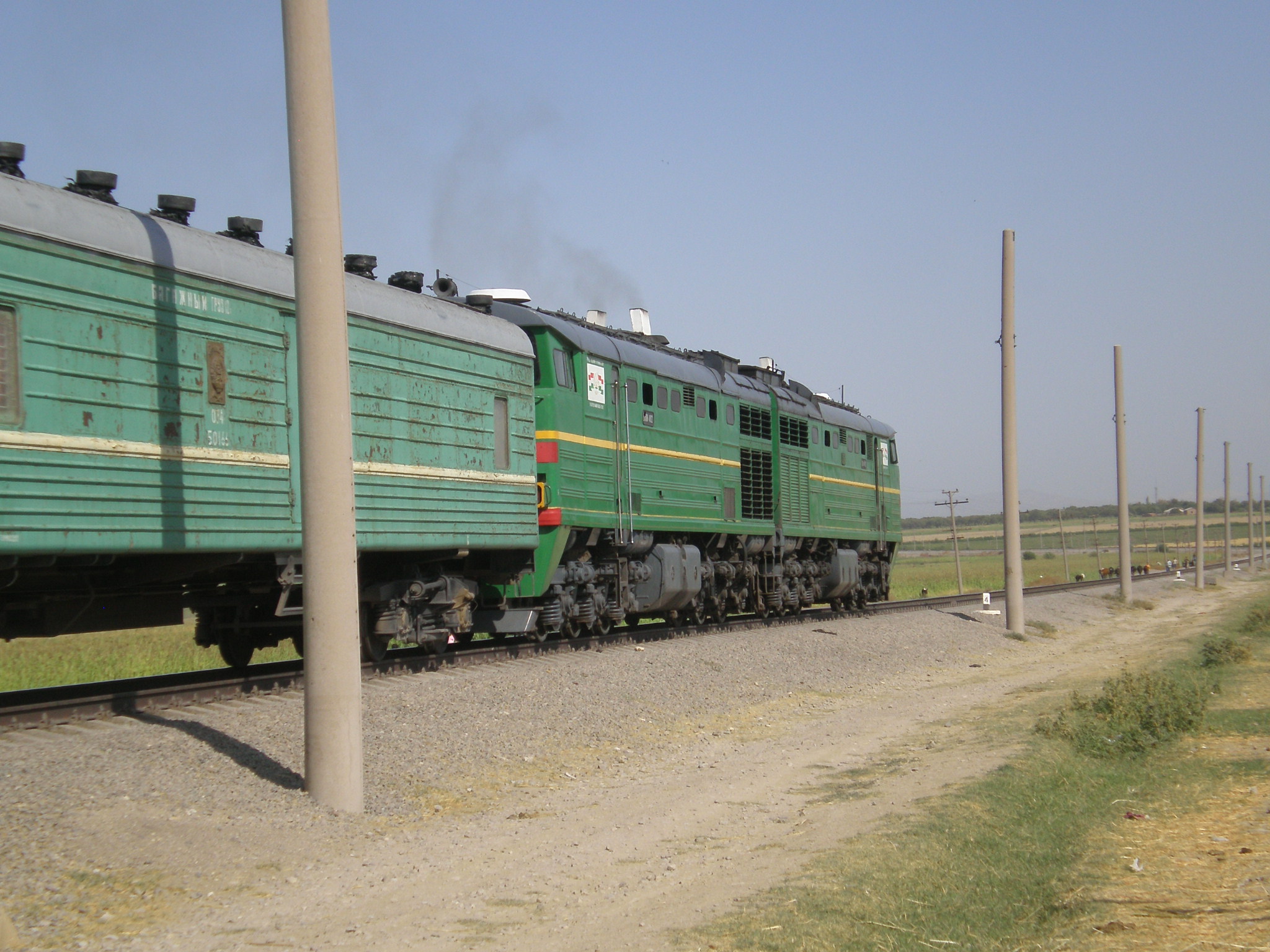 Тепловоз 2ТЭ10В-4822 ведёт пассажирский поезд сообщением Курган-Тюбе — Канибадам.