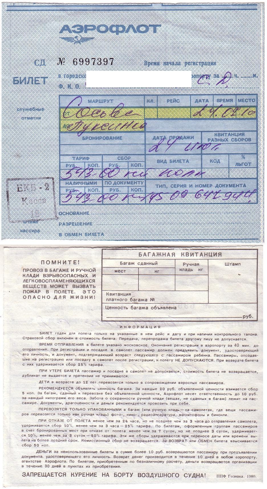 Билет Москва — Тюмень — Москва. Билет Москва — Тюмень — Москва был куплен по «спецпредложению» авиакомпании «Аэрофлот», обошёлся существенно дешевле стандартного тарифа.