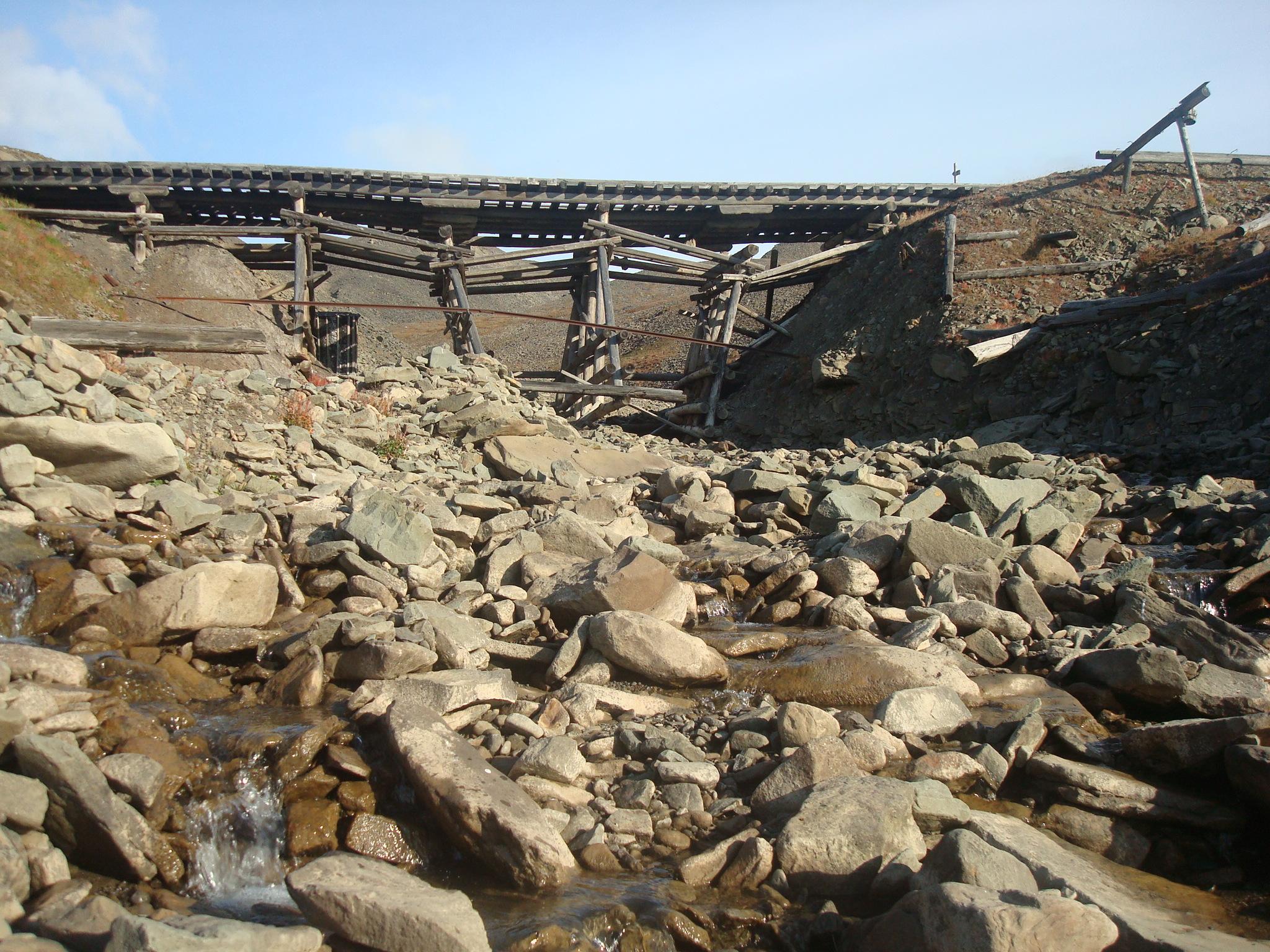 Из искусственных сооружений на Груманте сохранились деревянные водопропускные трубы и мост через ручей Русанова.