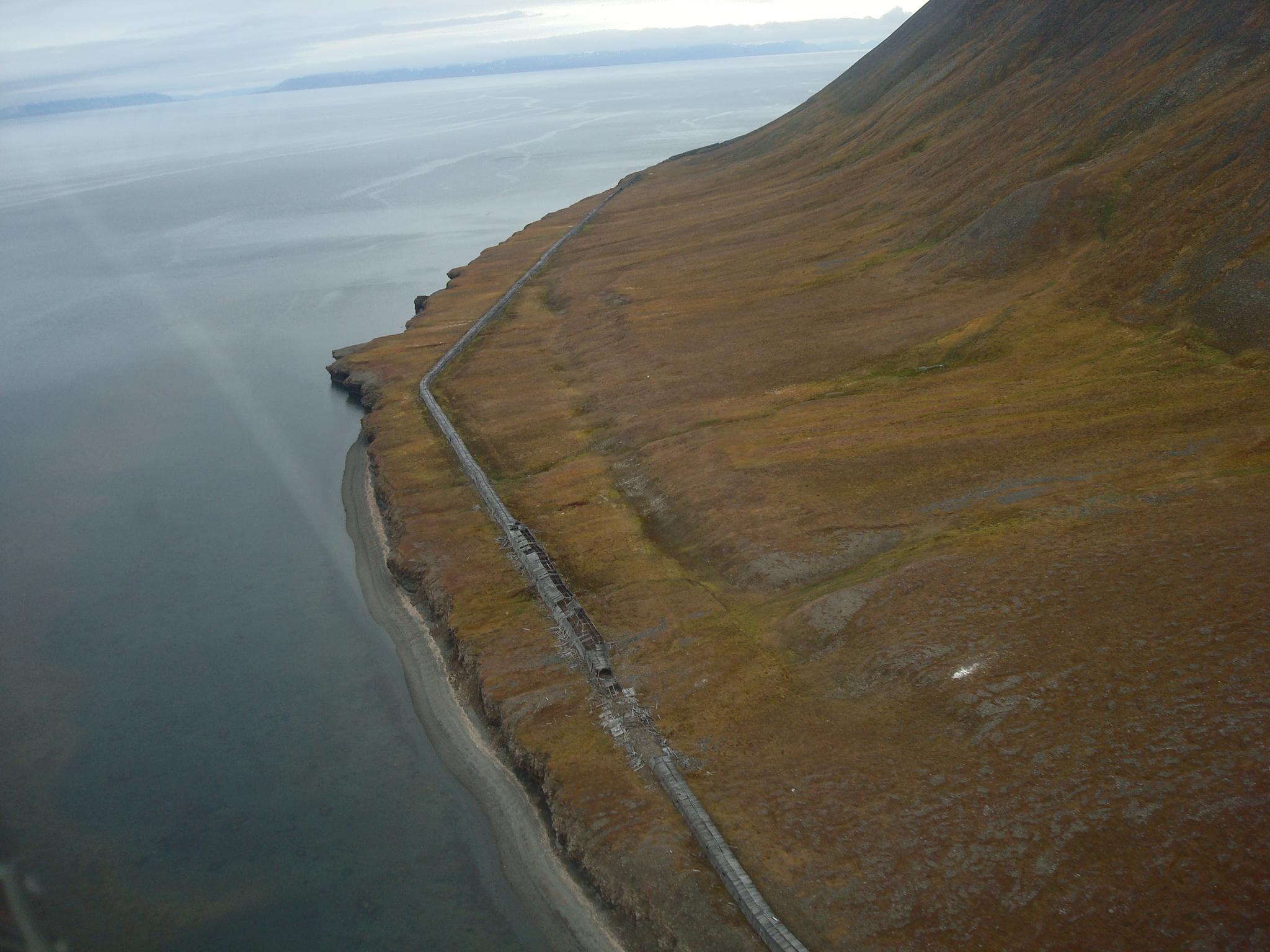 Так выглядит ныне с высоты 100 м участок трассы УЖД между посёлками Грумантом и Колсбеем по берегу Колесбухты.