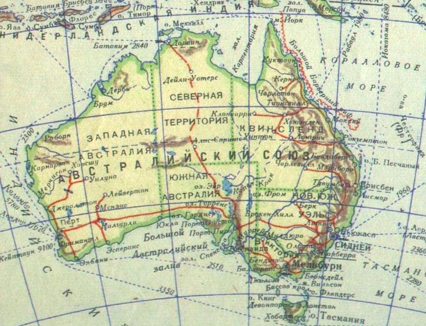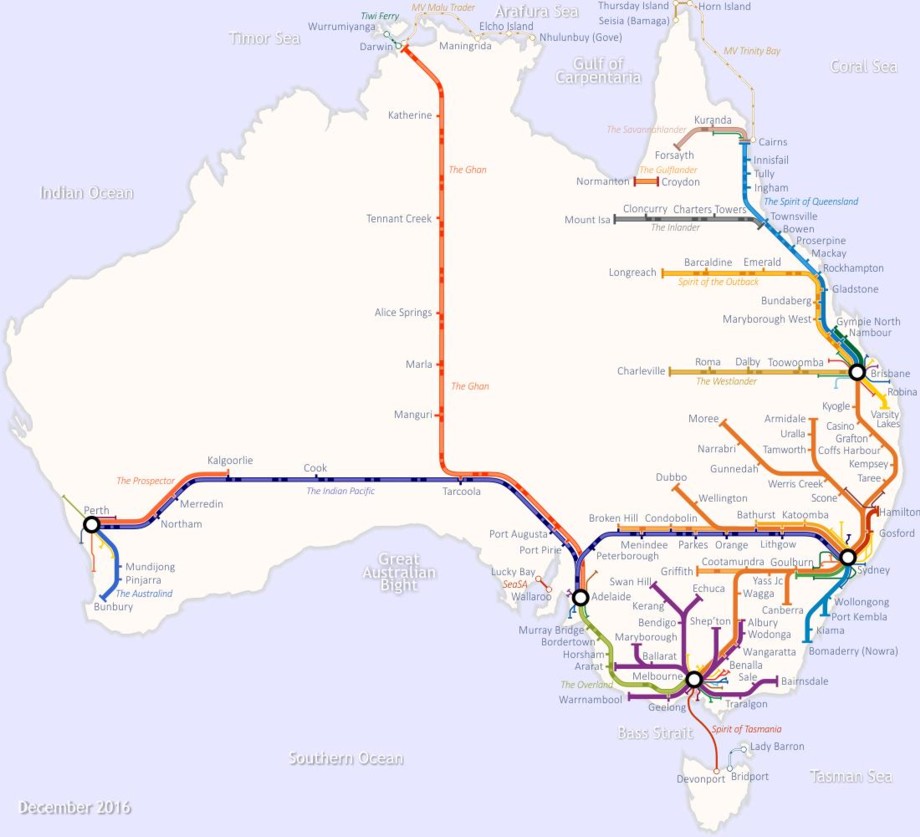 Австралия. Колея 1435 мм безоговорочно преобладает. Тем не менее, на ней не вся сеть страны. Имеется большое количество линий колеи 1067 мм, немного линий колеи 1600 мм.