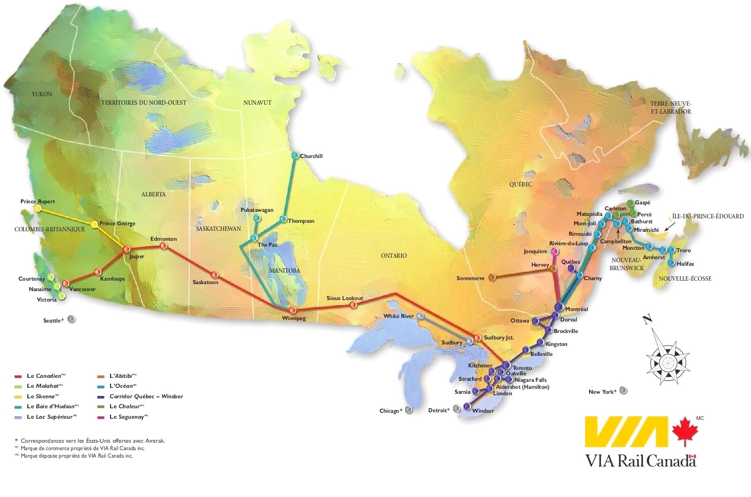 На железнодорожную сеть Канады, которая по своей протяжённости ещё сравнительно недавно была почти равна российской, осталось меньше десяти поездов дальнего следования. Все они, кроме короткой линии Виндзор — Торонто — Квебек, в ходу не ежедневно. В отличие от США, где почти все поезда ежедневные.
