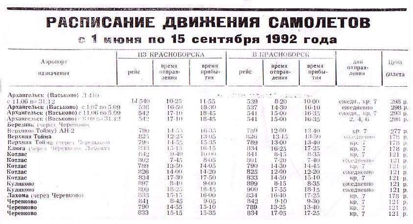 Расписания движения самолётов из аэропорта Красноборск (1991 год, 1992 год)