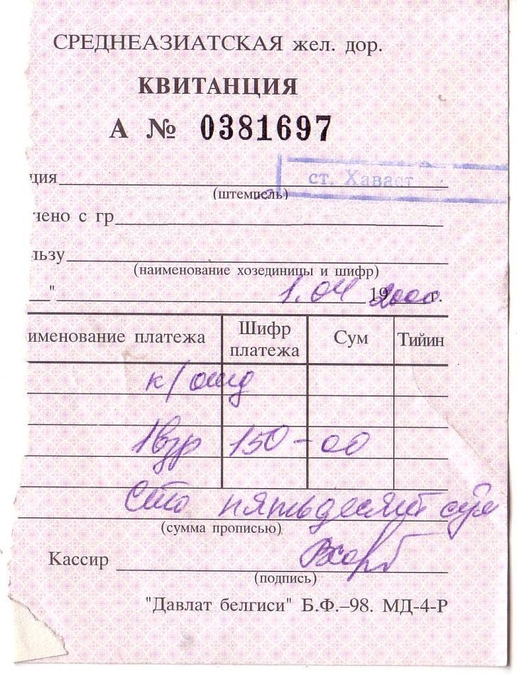 Квитанция за ночлег в комнате отдыха станции Хаваст. Оплачена узбекской милицией.