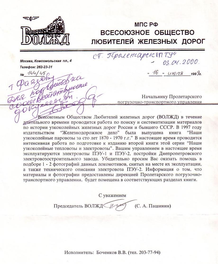 На листе бумаги содержалась просьба передать информацию по электровозам ПЭУ1 для готовящейся книги. Я попросил разрешения взять с собой это письмо — всё равно отвечать на него уже поздно. Таким необычным образом, оно вернулось почти что туда же, откуда пришло.