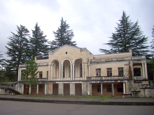 Заброшенный вокзал на станции Сакочави. «Советская» табличка