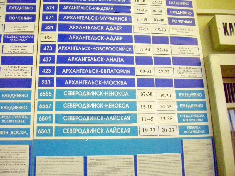 Вокзал на станции Северодвинск. Подавляющее большинство поездов, указанных здесь, отправляются со станции Архангельск. Всё, что есть именно здесь — это поезд на Москву раз в два дня и поезда до Нёноксы и Лайской. Лайская — это вторая станция в направлении Архангельска.